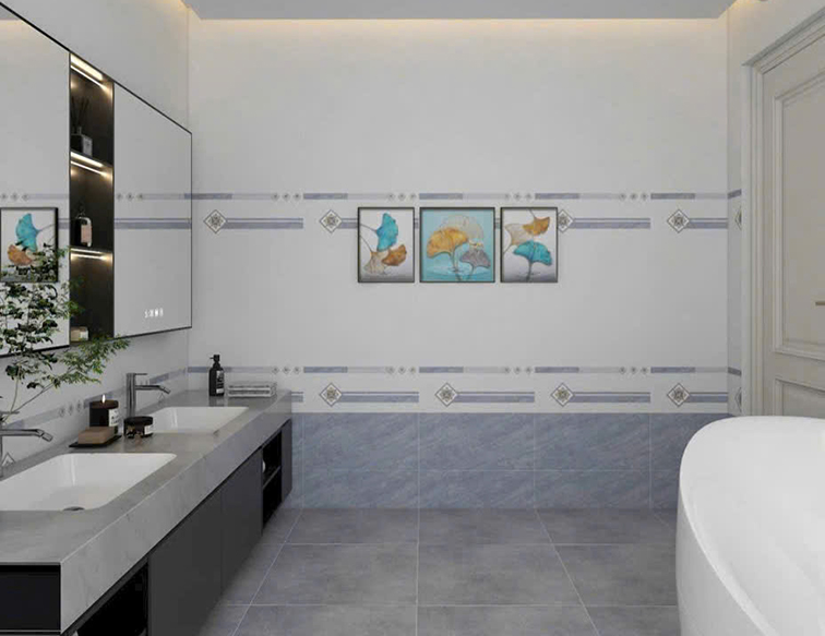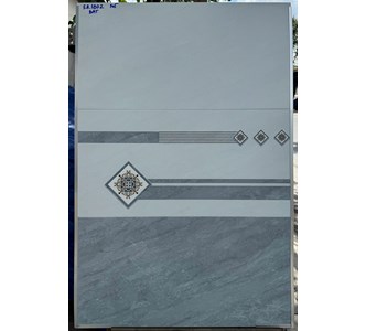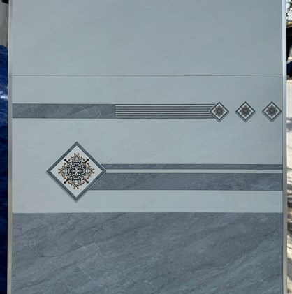 Gạch Ceramic, bề mặt phủ men mờ, màu xám nhạt vân đá, điểm họa tiết sọc ngang, hoa văn đối xứng hiện đại, sang trọng