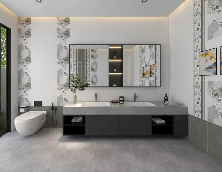 Gạch Ceramic, bề mặt phủ men mờ, màu xám vân xi măng, điểm họa tiết các khối lục giác kết hợp bông trắng hiện đại, sang trọng