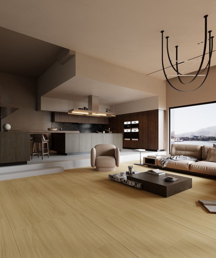 Chất liệu đá Porcelain, bề mặt mờ (Matt), màu nâu vàng nhạt, vân gỗ tự nhiên