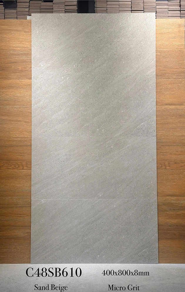 - Đá Porcelain cao cấp, màu xám nhạt, vân bê tông hiện đại