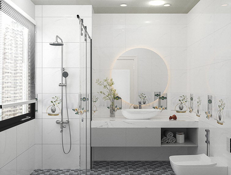 - Màu trắng vân khói xám nhạt, điểm họa tiết bình bông trắng nhụy vàng độc đáo, sang trọng