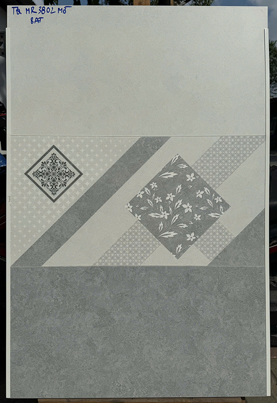 - Gạch men mờ, màu xám ghi vân đá, điểm họa tiết hình học, hoa văn tinh tế, hiện đại