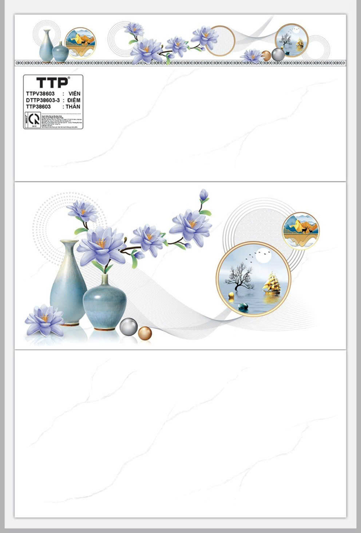 • Màu trắng vân khói, điểm họa tiết bình bông xanh, viền họa tiết bông xanh đơn giản, sang trọng