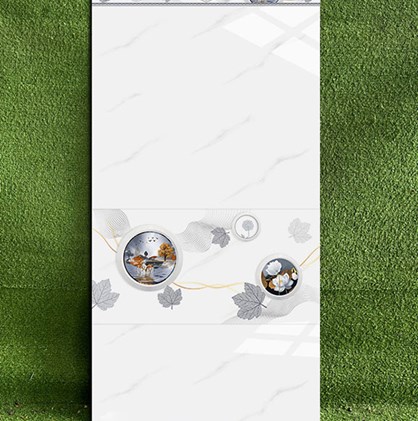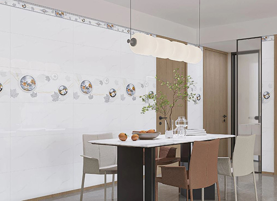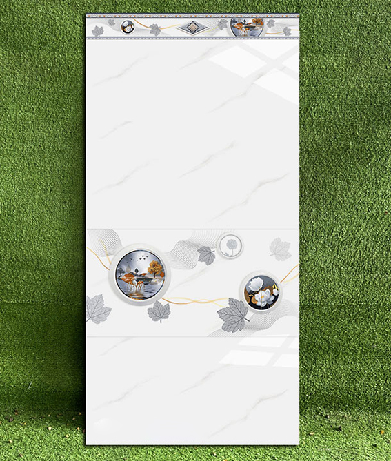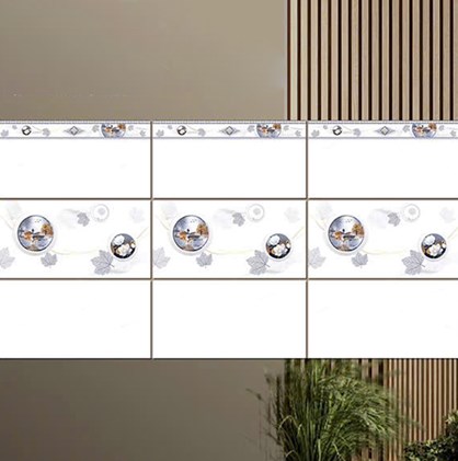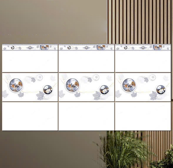 - Gạch men bóng, màu trắng vân khói, điểm họa tiết hình tròn, hoa lá độc đáo