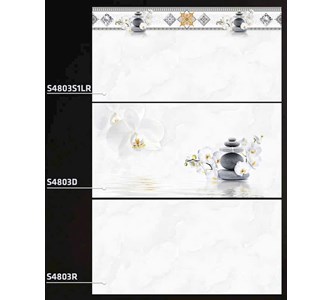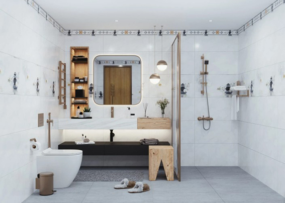- Gạch men bóng, màu trắng vân đá, điểm họa tiết hoa lan, sóng nước độc đáo